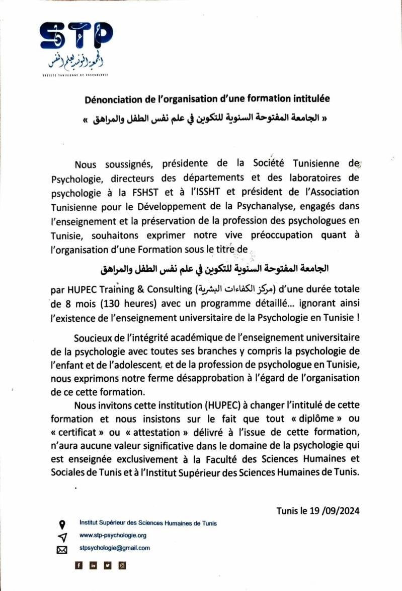 مراسلة حول "شهادة دراسات تكميلية" موقعة من الهيئات العلمية في علم النفس (رؤساء قسم علم النفس بكل من كلية العلوم الإنسانية والاجتماعية والمعهد العالي للعلوم الإنسانية بتونس، ورئيس مخبر علم النفس ورؤساء الجمعيات العلمية والنقابات الخاصة بالأخصائيين النفسانيين) مرسلة إلى